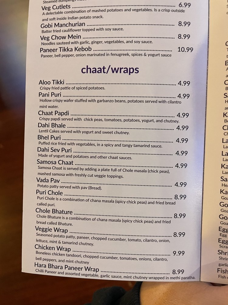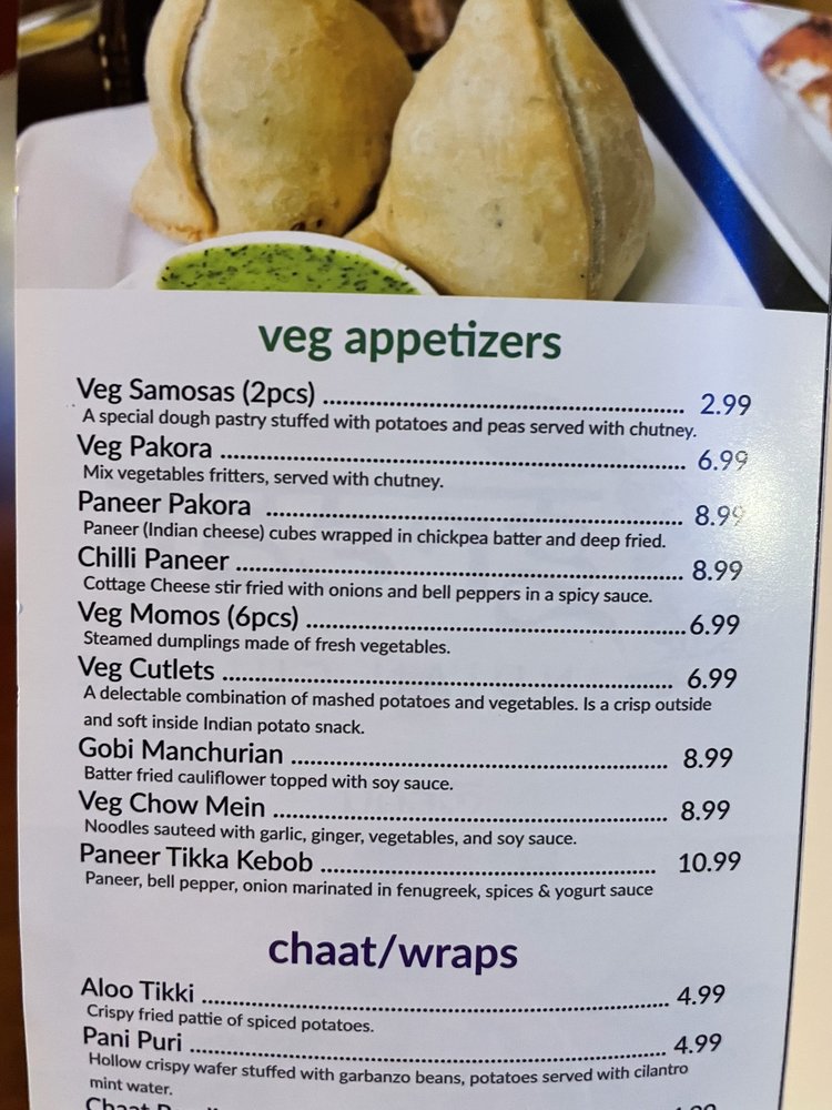 Seasoned potato patty, paneer, chopped cucumber, tomato, cilantro, onion, lettuce, mint and tamarind chutney.