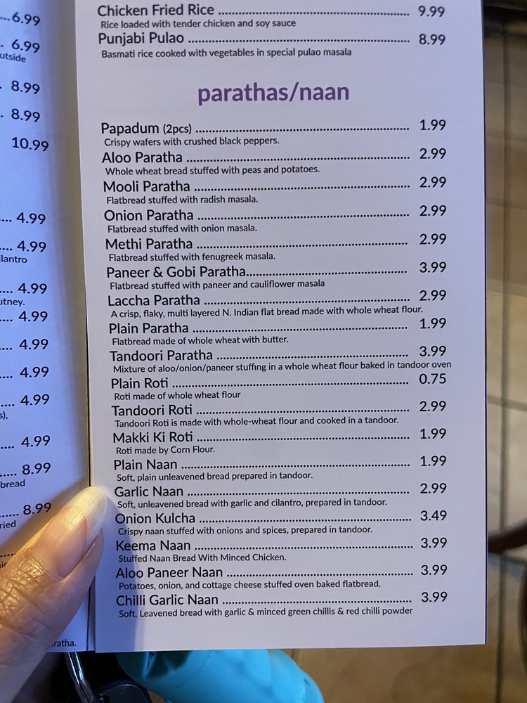 Mixture of aloo, onion, paneer stuffing in a whole wheat flour baked in tandoor oven.